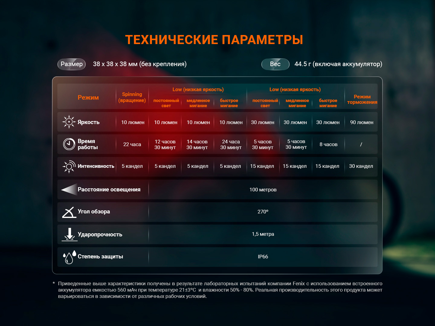 - Spinning (режим вращения) — 10 люмен — 22 часа — 5 кандел;