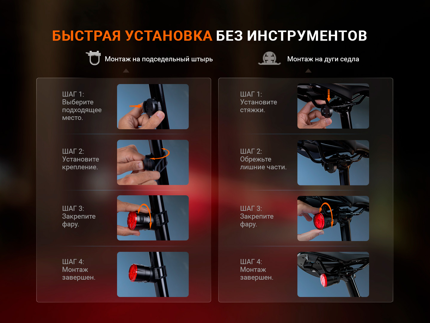 - быстрая установка на дуги седла или на подседельный штырь;
