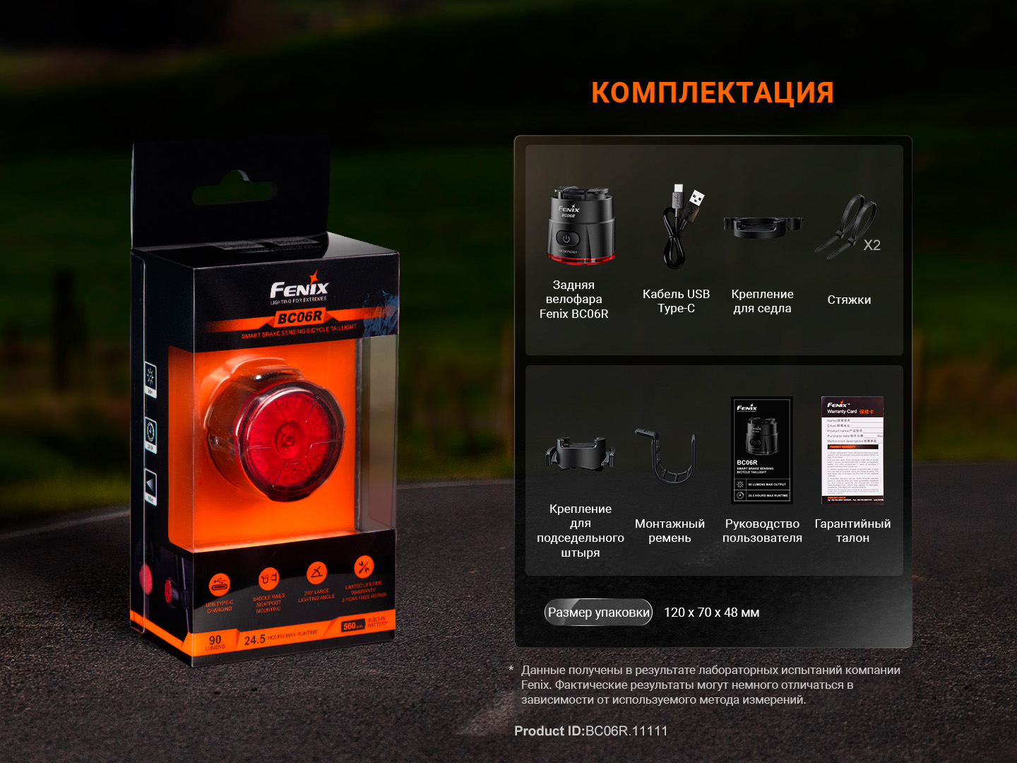 - комплектация — велофара Fenix BC06R, USB Type-C кабель, крепление на седло, стяжки х2, крепление для подседельного седла, монтажный ремень, руководство пользователя, гарантийный талон;