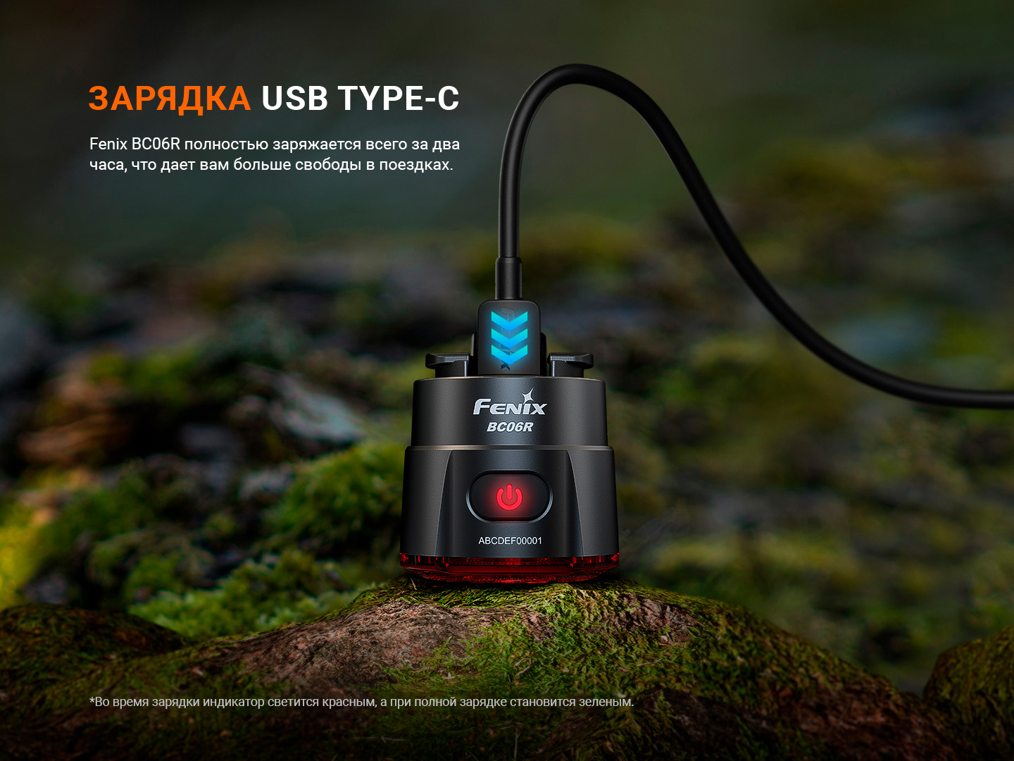 В велофонаре установлен перезаряжаемый аккумулятор емкостью 560 мАч, который обеспечивает время работы до 24.5 часов и будет незаменим при длительных поездках. При этом зарядить прибор можно всего за 2 часа с помощью кабеля USB Type-C, который идет в комплекте. Для получения информации об уровне заряда достаточно нажать на кнопку выключателя. Постоянный зеленый свет означает, что уровень заряда от 85 до 100%, мигающий зеленый — от 50 до 85%, красный — от 25 до 50%, мигающий красный — от 1 до 25%.