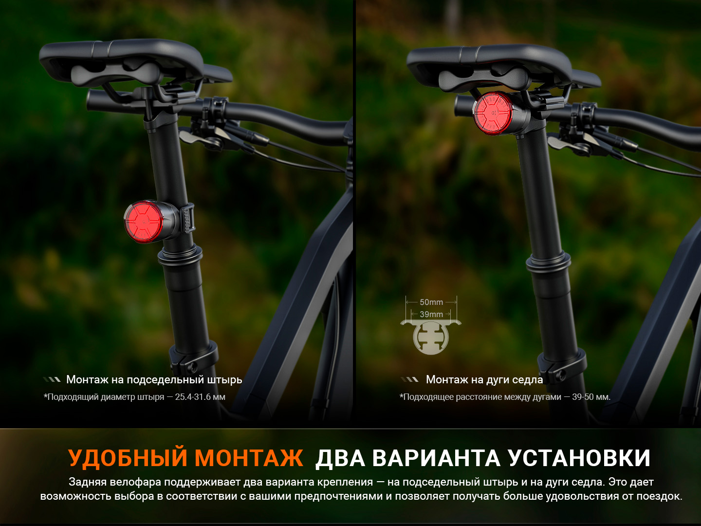 Велофара BC06R просто и удобно устанавливается на велосипед без использования дополнительных приспособлений. Ее можно закрепить двумя способами: на дуги седла и на подседельный штырь. Для установки на дуги седла расстояние между ними должно быть от 39 до 50 мм. А если вы решите использовать в качестве основания подседельный штырь, его диаметр должен составлять от 24.4 до 31.6 мм.