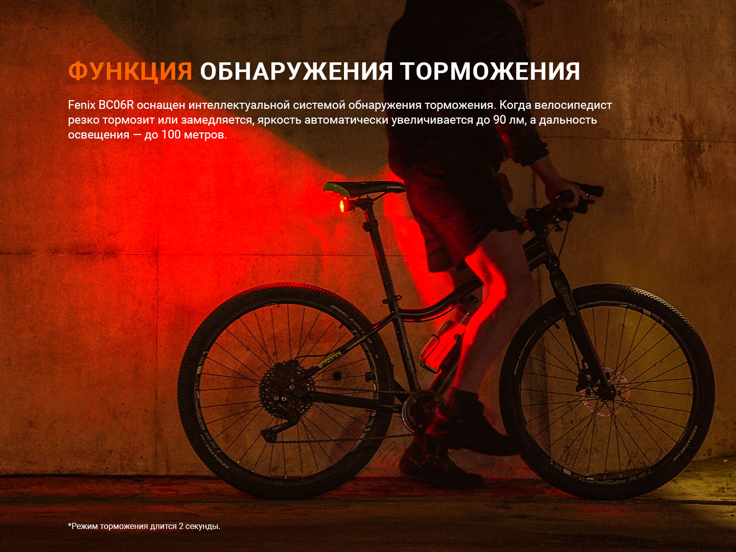 Задний велосипедный фонарь обладает функцией памяти. Он запоминает последний выбранный режим (за исключением программы интеллектуального торможения) и при следующем включении будет использовать именно его. Это значительно упрощает использование габаритного фонаря и позволяет вам не тратить время на настройку велосипедного освещения каждый раз при подготовке к поездке. Функция торможения срабатывает при быстром снижении скорости, повышая яркость до 90 люмен на несколько секунд.