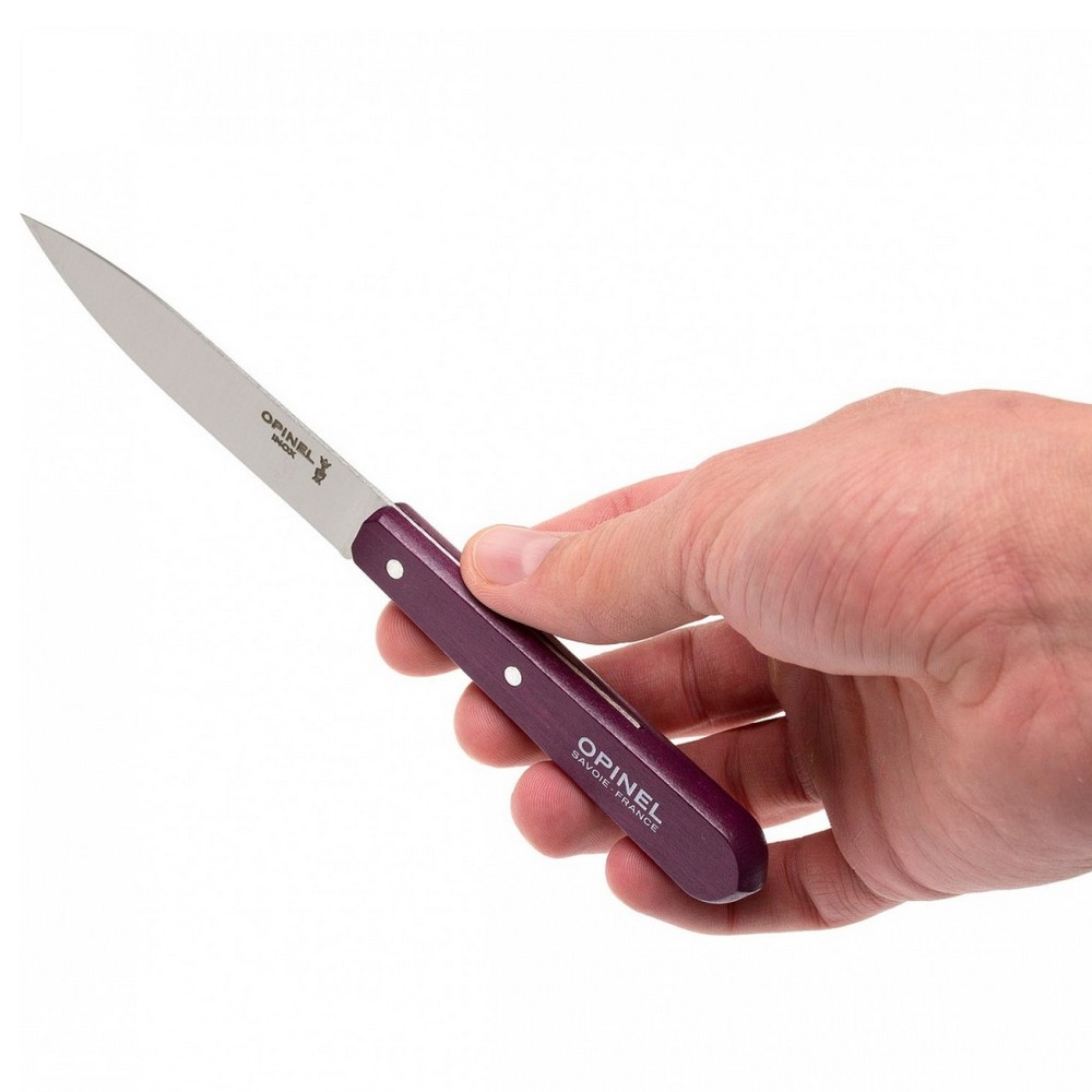 Столовый нож универсального назначения, запросто режет, измельчает и очищает. Длина лезвия – 10 сантиметров. В основе клинка – сталь марки 12C27 от Sandvik, этот сплав еще именуется мартенситным. При содержании в составе стали не менее 0,40% углерода удается получить очень неплохую режущую кромку. К тому же, это довольно твердый сплав (56-58 единиц по Роквеллу), и отлично защищен от коррозии. Рукоять ножа выполнена из массива граба - очень твердая, надежная и долговечная порода древесины, имеет красивую структуру. Поверхность рукояти качественно обработано и покрыто стойкой краской сливового цвета. Изделие обладает всеми необходимыми свойствами для качественной резки. Достойное дополнение к вашей кухне. Страна производства - Франция.