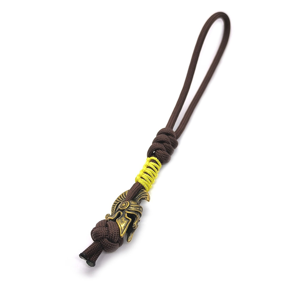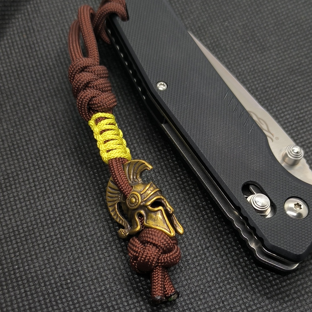 Темляк из паракорда TYPE III 550 ⌀3.5mm Bordo Color и миникорда Type I 100 ⌀1.2mm Lemon Color с декоративной бусиной "Спартак" из латуни. Изделие отличается высокой прочностью, стойкостью к воздействию влаги и грязи. Станет отличным дополнением к ножику, может использоваться как декоративный элемент для экипировки и др. В экстремальных случаях темляк можно расплести и получить прочный шнурок, который можно использовать для многих задач.