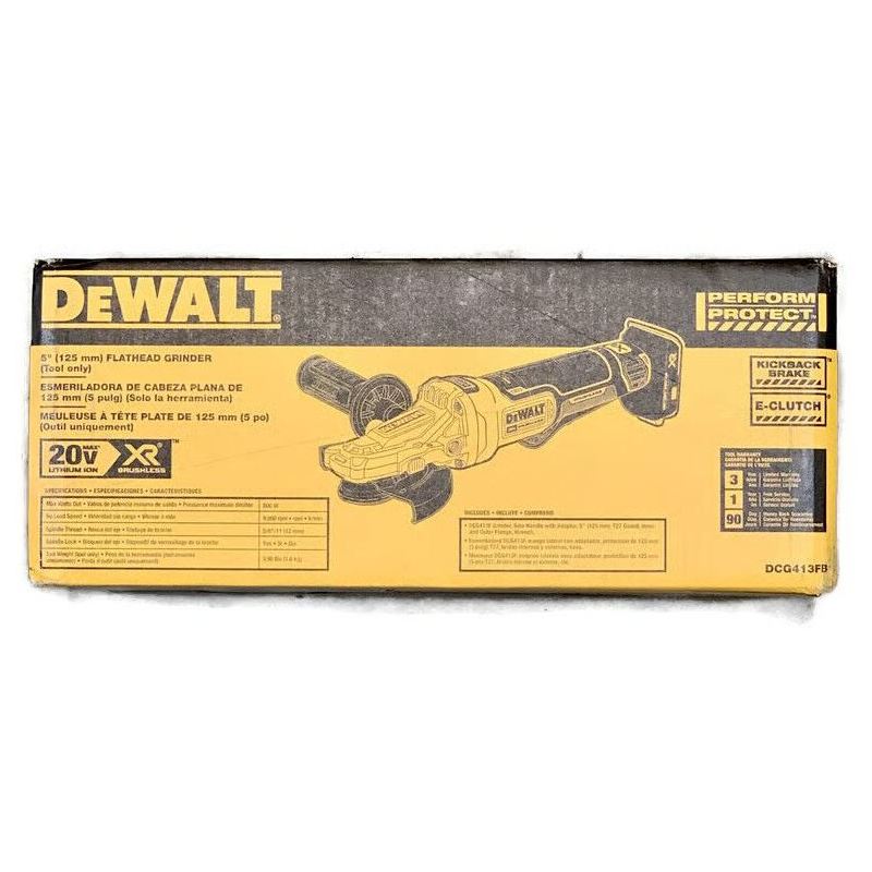 Модель для американского рынка с маркировкой 20V, работает от любых батарей 18V. Главной особенностью модели является плоская конструкция редуктора (Flathead), позволяющая работать в труднодоступных местах и под острыми углами, недоступными для стандартных УШМ. Инструмент представляется современную аккумуляторную болгарку с множеством передовых технических и дизайнерских решений. Маркировка Perform & Protect означает, что большое внимание было уделено безопасности при работе с болгаркой: плавный пуск, тормоз двигателя, расцепная муфта, антивибрационная система и др. Инструмент работает на базе аккумуляторной платформы XR от DeWALT, благодаря уникальному фирменному бесщеточному двигателю достигается продолжительное время работы на одном заряде при высоких показателях производительности. Лепестковый выключатель (Paddle Switch) представляет собой двухпозиционную клавишу, которая требует двух действий для запуска, что предотвращает случайное включение инструмента. Превосходная эргономика и качество исполнения. Инструмент поставляется без аккумуляторов и зарядного устройства в коробке.