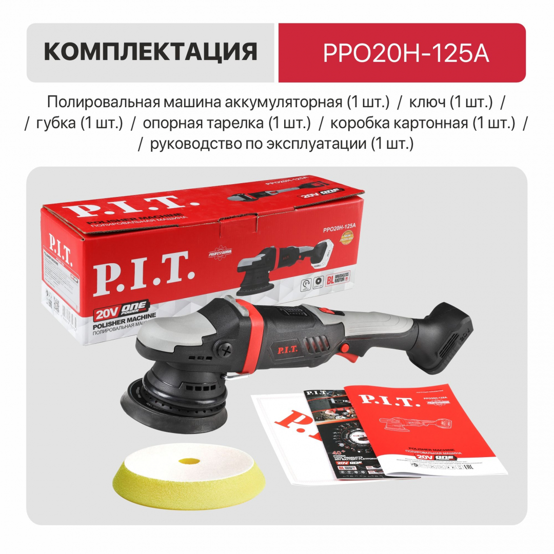 Полировальная машина P.I.T. PPO20H-125A OnePower 20V предназначена для полировки и шлифования поверхностей из различных материалов, включая лакокрасочные покрытия, древесину и металл. Модель оснащена бесщеточным двигателем и регулировкой оборотов, что позволяет гибко подбирать режим под задачу. Инструмент работает от аккумуляторной платформы OnePower 20V и поставляется в версии SOLO — без аккумулятора и зарядного устройства.