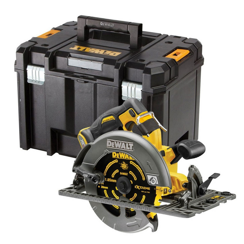 Модель с пазами в подошве для направляющей шины, является обновлением пилы DCS576. Новинка получила усовершенствованный бесщеточный двигатель с выходной мощностью 2262 Вт на аккумуляторе DCB546 и приростом до показателя 2456 Вт на более мощной батарее DCB547. Технология E-CLUTCH® позволяет защитить от перегрузок, автоматически выключит инструмент при перегреве двигателя. Фирменный замок Spinde фиксации диска надежный и удобный. Фланец стандартный 30 мм. Тормозная система Brake® практически моментально останавливает вращение диска, что уменьшает вероятность случайного травмирования. Встроенная LED подсветка для лучшей видимости линии реза. Эффективный пылеотвод, совместимы с системой Air Lock. Инструмент обладает превосходной эргономикой и удобным управлением, предусмотрена возможность фиксации пусковой клавиши для продолжительных работ. Общий дизайн схож с предыдущей моделью, только добавлен откидной крюк для подвешивания пилы на стропило или стенд во время работы или хранения. Пила DeWALT DCS579NT-XJ поставляется без аккумуляторов и зарядного устройства в модульном ящике T-STAK с базовым набором аксессуаров.