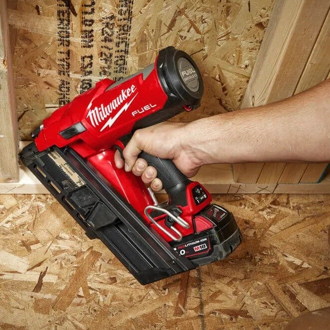 - Стреляет стандартными гвоздями, которые подходят для наклонного магазина (30° или 34°)