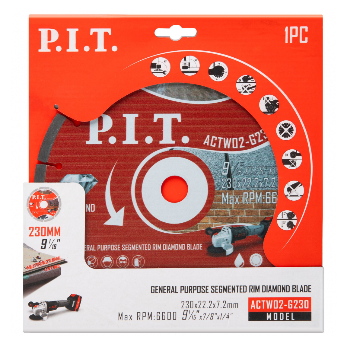 Алмазный диск P.I.T. ACTW02-G230 представляет собой универсальную сегментированную оснастку увеличенного диаметра (230 мм), предназначенную для выполнения масштабных строительных и демонтажных работ. Основное назначение данной модели — быстрая и эффективная резка тяжелых материалов: бетона, кирпича, природного камня, цементных блоков и тротуарной плитки. Благодаря сегментированной режущей кромке, диск обеспечивает отличный теплоотвод и быстрый вывод шлама, что позволяет производить глубокие пропилы (до 60-65 мм) без обязательного использования водяного охлаждения, сохраняя высокую производительность на протяжении всего срока службы.