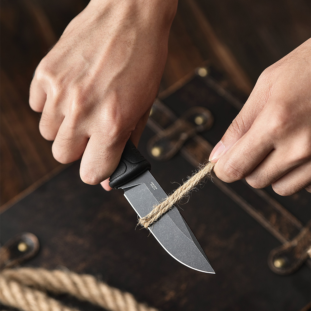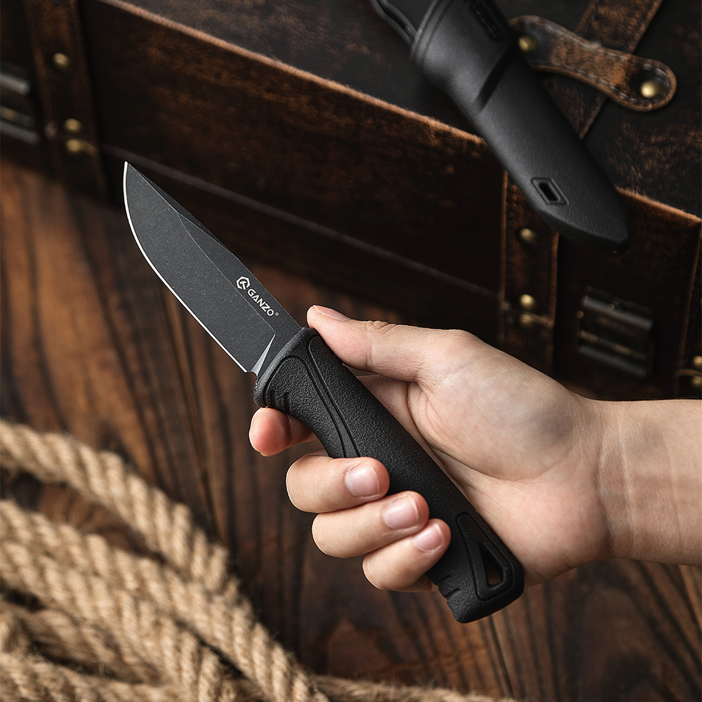 Тактическая версия модели Ganzo G807 с черной рукояткой и покрытием клинка Black Stonewash. Данный ножик отлично подойдет для нарезания продуктов, при этом эффективно справится с такими сложными задачами, как перерезание жилистых материалов, строгание и др. Клинок изготовлен из качественной коррозиестойкой китайской марки стали 9Cr14MoV с закалкой в пределах 59-60 HRC. Лезвие имеет классический профиль Drop Point с высокими спусками на ⅔ ширины, что обеспечивает оптимальный баланс между его механической прочностью и качеством реза. Кончик острый, обработка поверхности - StoneWash. Рукоять представляет собой сочетание синтетического полипропилена и прорезиненного покрытия, поэтому с ножиком удобно работать как голыми руками, так и в перчатках. Предусмотрено отверстие для темляка. Ножны внешне стилизованы под дизайн модели, надежно фиксируют нож с приглушенным щелчком. Сквозное отверстие в нижней части отвечает за беспрепятственный слив воды, которая может остаться на клинке после эксплуатации.