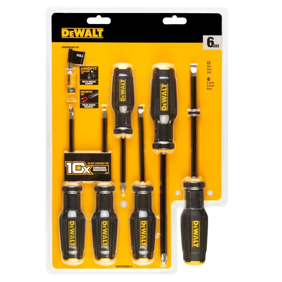 Набор из 6-и профессиональных отверток с длиной стержня 150 мм линейки MAXFIT™ под прямой шлиц SL5.5, SL6.5, SL8 и крест PH1, PH2, PH3, а также бонусного магнитного замка, который самостоятельно удерживает саморез на шлице. Отвертки обладают повышенной в 10 раз коррозийной стойкостью благодаря фирменному черному хромированию. Наличие стального сердечника с массивным металлическим затыльником позволяет использовать отвертки в качестве долота и наносить удары молотком. Жала намагничены. Комплект поставляется в фирменной блистерной упаковке.