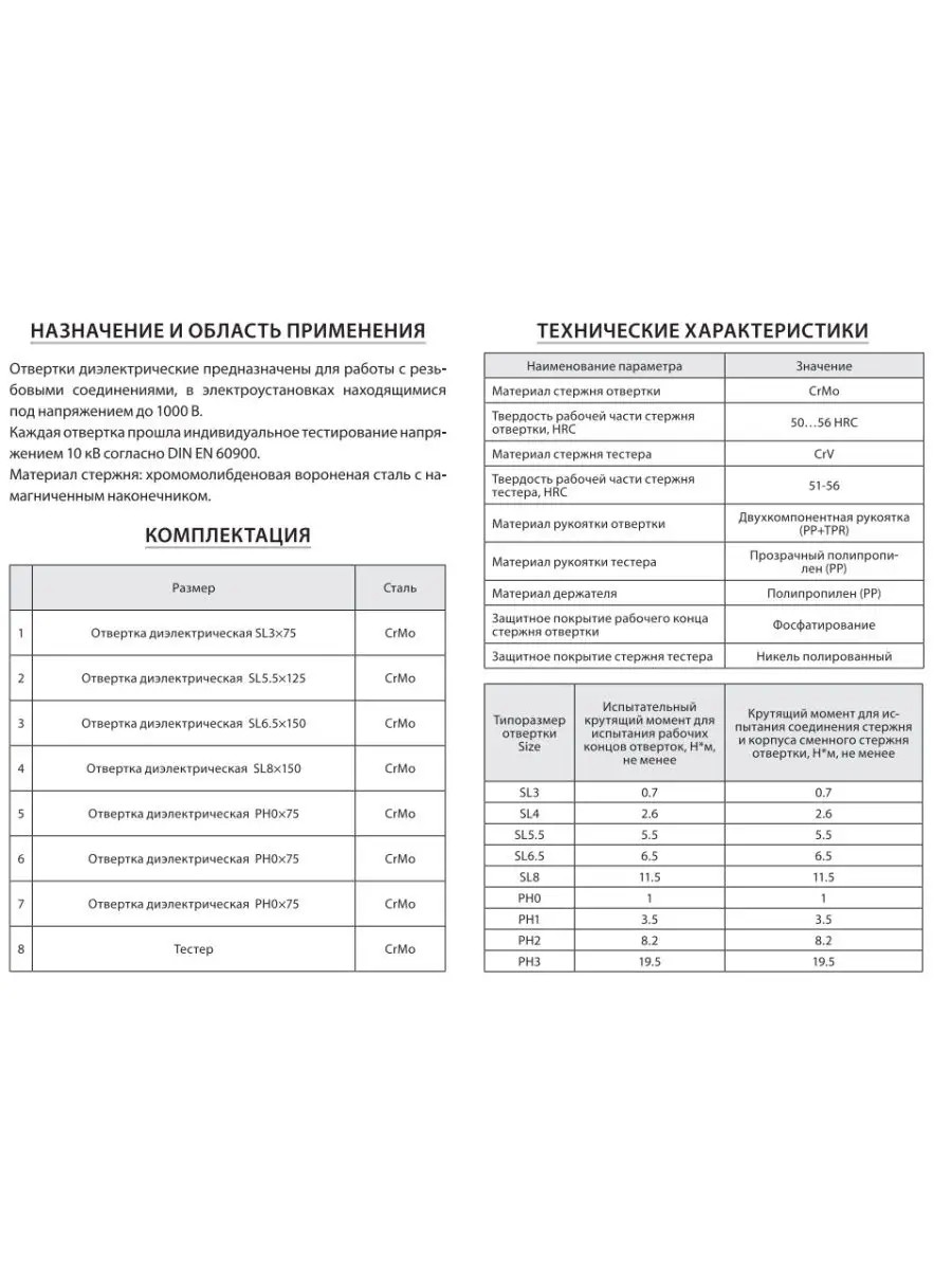 Набор GROSS 12950 состоит из 8-и диэлектрических отверток VDE 1000V с двухкомпонентными рукоятками, которые позволяют проводить монтаж/демонтаж крепежных элементов типа PH и SL под напряжением до 1000 Вольт. Стержни изготовлены из прочного стального хромомолибденового сплава (CrMo), имеют диэлектрическое защитное покрытие. Жала отверток намагничены. Двухкомпонентные рукоятки отверток не проскальзывают в руке. Рукоятки отверток и полка-держатель имеют отверстия для удобного хранения набора. Сертификаты VDE и GS подтверждают качество и безопасность отверток.
